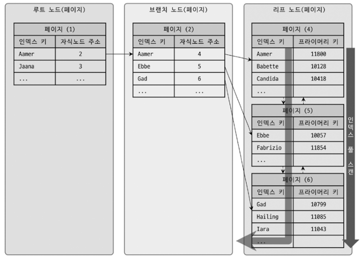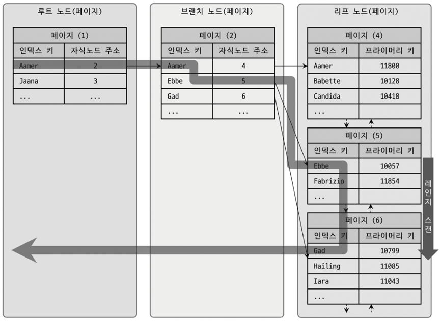 - 페이지의 끝까지 읽으면 리프 노드간의 링크(Linked list)를 이용해 다음 리프 노드를 찾아서 다시 스캔한다.