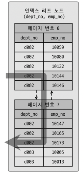 - " dept_no = 'd002' AND emp_no >= 10114 " 인 레코드를 찾고, 그 이후에는 dept_no가 'd002'가 아닐 때까지 인덱스 스캔