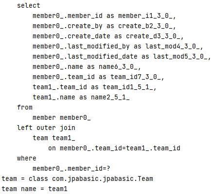 em.find(Member.class, member1.getId()) 시점에 TEAM 을 조인해서 조회한다.