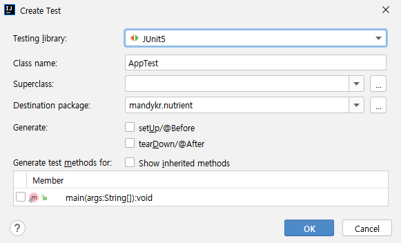 만든 프로젝트를 JUnit 5 를 지원하는 버전의 IntelliJ 에서 열고 테스트 클래스를 만든다.