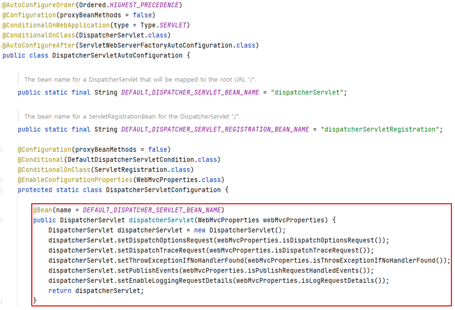 DispatcherServlet 빈을 스프링 컨테이너에 하는 걸 볼 수 있다.