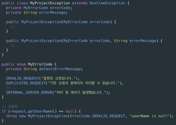 자바에서 제공하는 Exception이 아닌 커스텀 Exception을 만들어 사용할 수 있다.