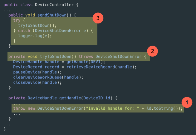 상위 레벨에서는 예외를 catch 하여 처리하거나 메소드 선언부에 throws를 명시한다.