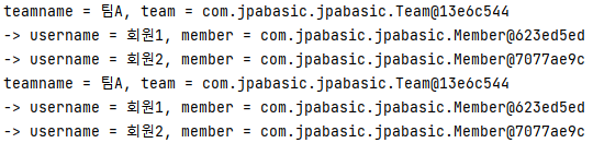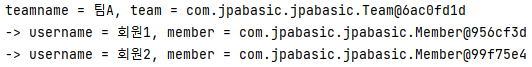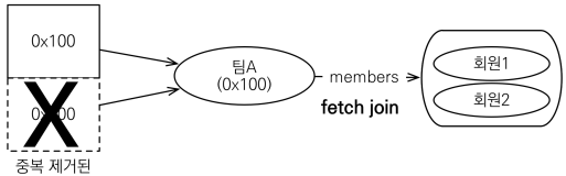 JPQL도 마찬가지로 같은 객체이지만 팀A의 참조값이 페치 조인 결과 리스트에 중복되어 저장된다.