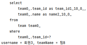 지연 로딩인 경우 실제 Team의 데이터를 사용하는 시점에 조회 쿼리가 실행된다.