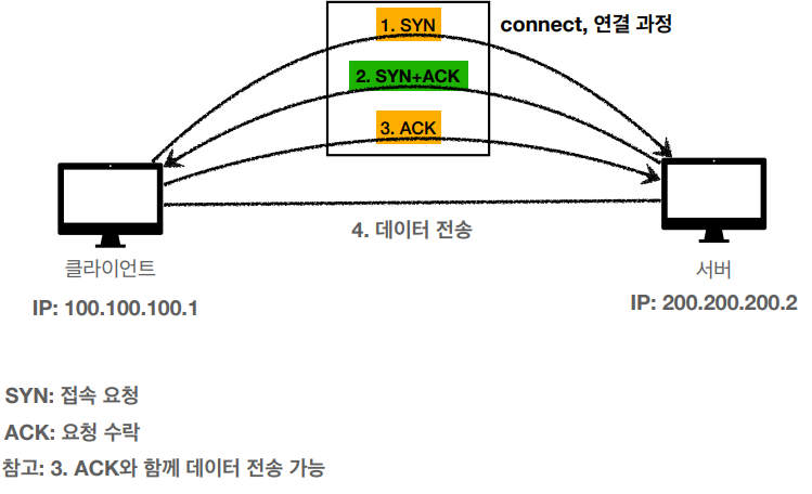3 way handshake 방식을 사용해 클라이언트 서버간에 연결한다.