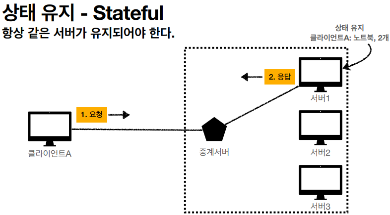 - 상태를 서버에서 갖고있기 때문에 항상 같은 서버가 유지되어야 한다.