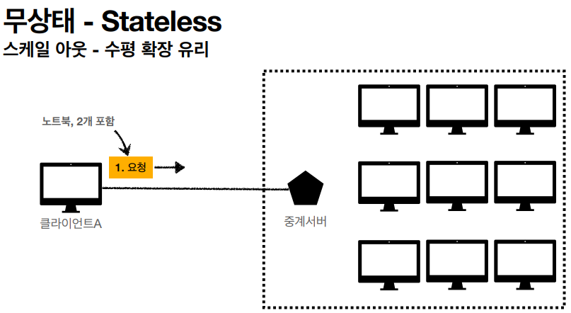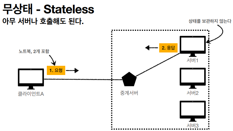 - 무상태는 응답 서버를 쉽게 바꿀 수 있다. -> 무한한 서버 증설 가능