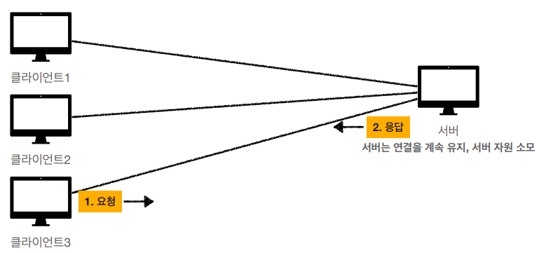 당장 사용하지 않는 클라이언트와 연결을 유지하기 때문에 서버 자원을 낭비하게 된다.