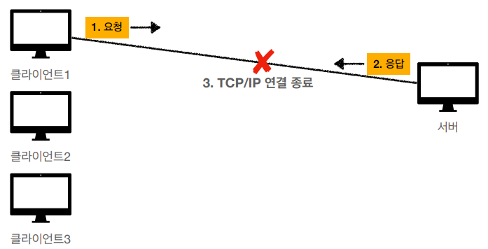 요청과 응답이 필요한 경우에만 연결하고 응답이 완료되면 연결을 끊는다.