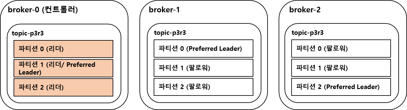 파티션 별로 최초 할당된 Leader/Follower Broker설정을 Preferred Broker로 그대로 유지한다.