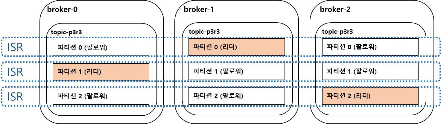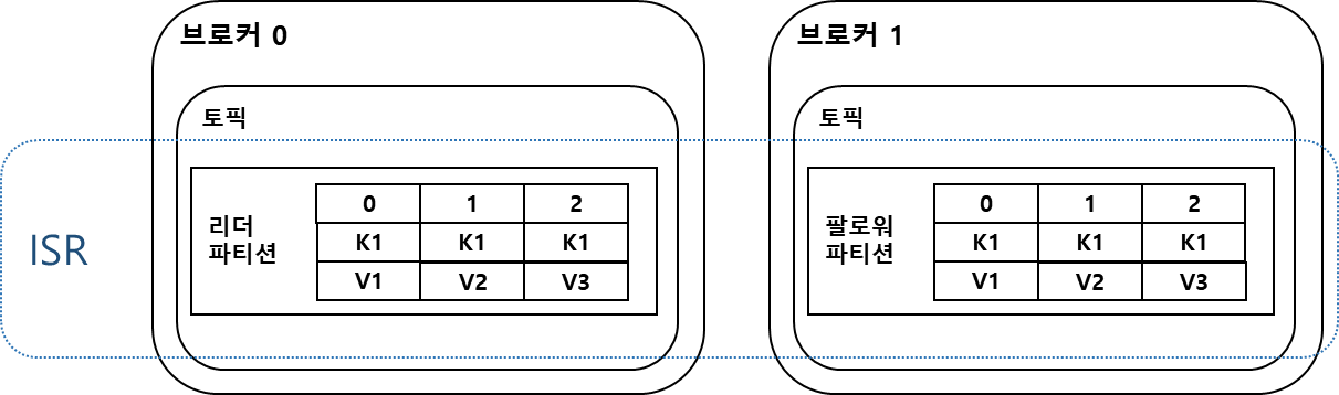ISR(In-Sync-Replicas)은 리더 파티션과 팔로워 파티션이 모두 싱크가 된 상태를 뜻한다.