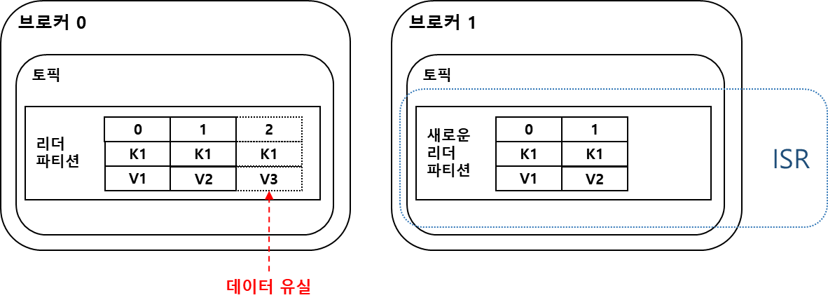 - 동기화되지 않은 파티션이 리더로 선출되므로 일부 데이터가 유실될 수 있다.