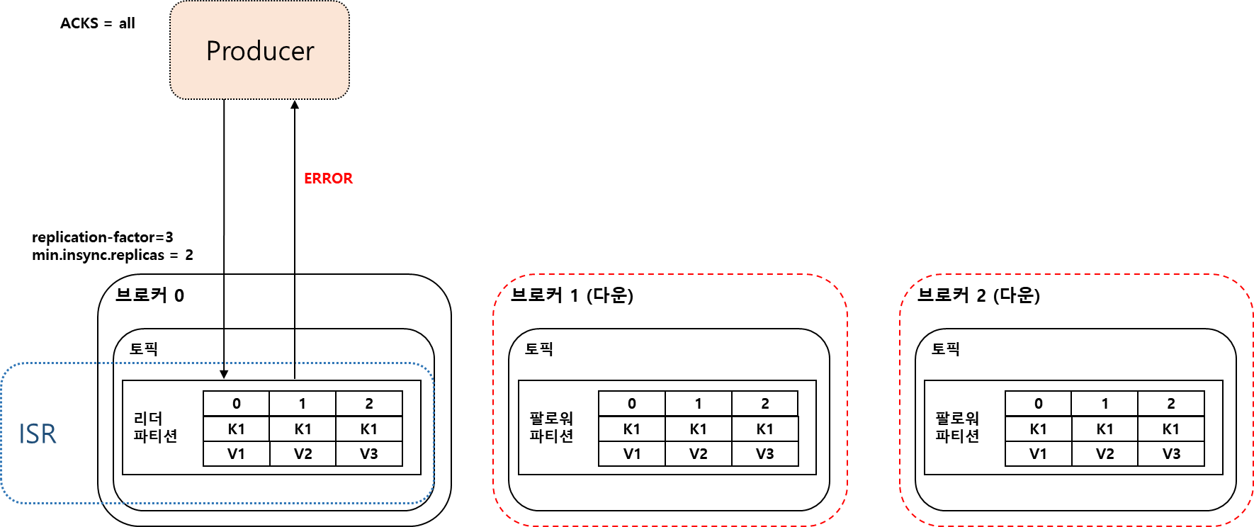 min.insync.replicas 파라미터는 브로커의 설정값으로 Producer가 acks=all 로 성공적으로 메시지를 보낼 수 있는 최소한의 ISR 브로커 개수를 의미한다. 프로듀서의 Acks=all 일때, min.insync.replicas 값보다 ISR 브로커의 개수가 작으면 프로듀서에게 Error를 반환한다. (NotEnoughReplicasException 또는 NotEnoughReplicasAfterAppendException)