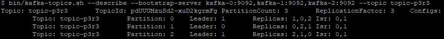 Topic: topic-p3r3 Partition: 1 Leader: 0 Replicas: 0,2,1 Isr: 0