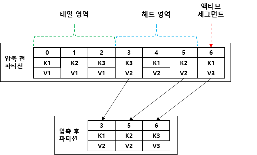 동일한 메시지 키를 기준으로 오래된 데이터를 삭제하기 때문에 파티션의 오프셋과 관계없이 중간에 있는 레코드가 삭제될 수 있다.