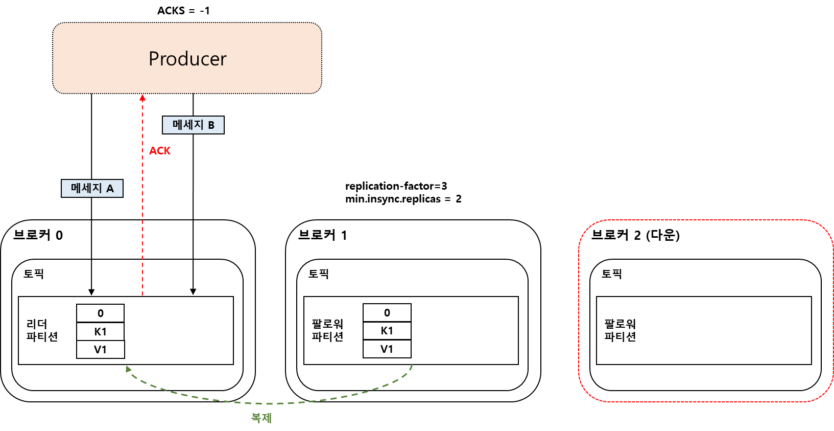 또한, 하나의 파티션에 서로 다른 키를 가지는 메시지가 저장될 수 있다.