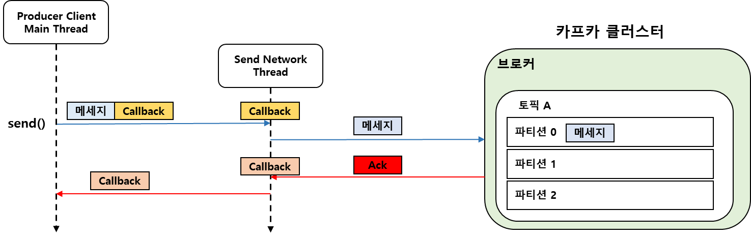 Producer Client의 Main Thread가 send( ) 메소드를 호출하면 메시지 전송을 시작하지만 바로 전송되지 않으며 내부 Buffer에 메시지를 저장 후에 별도의 Thread가 Kafka Broker에 실제 전송을 하는 방식이다.