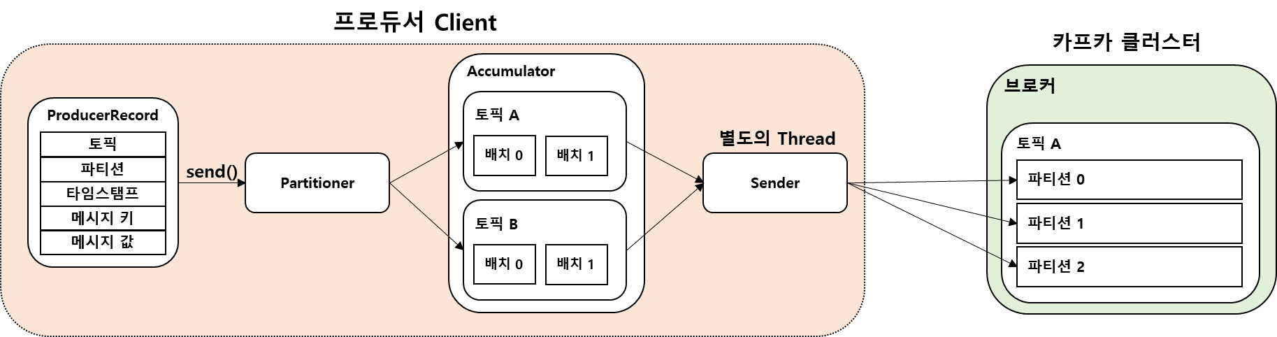 KafkaProducer 객체의 send( ) 메소드는 호출 시마다 하나의 ProducerRecord를 입력하지만 바로 전송 되지 않고 Accumulator에 단일 메시지를 토픽 파티션에 따라 Record Batch 단위로 묶인 뒤 전송된다.