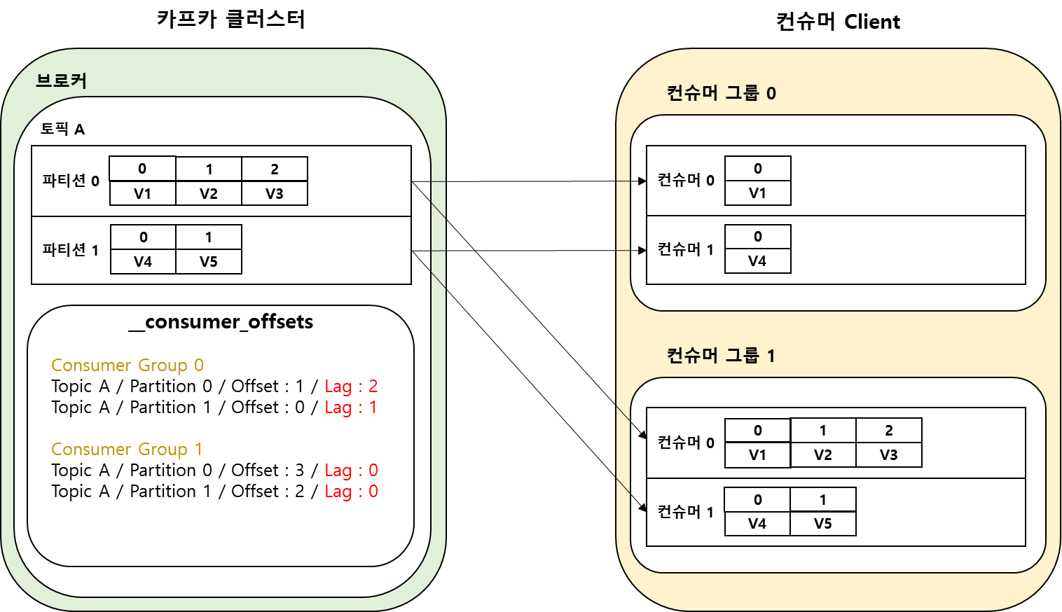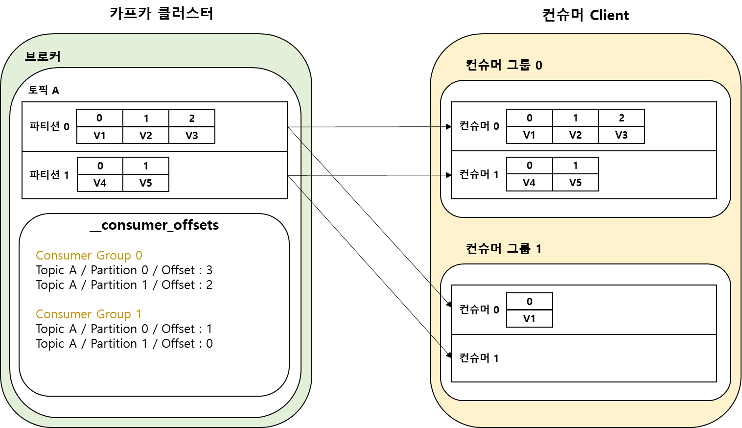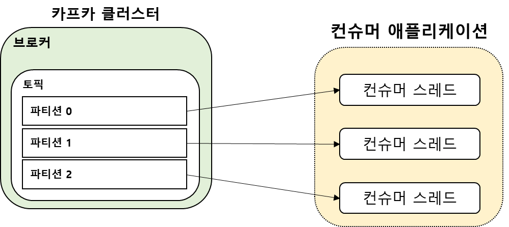 카프카 컨슈머는 하나의 컨슈머 그룹에 속해 실행되며 카프카 브로커의 파티션은 컨슈머 그룹내 하나 이상의 컨슈머에 할당된다.