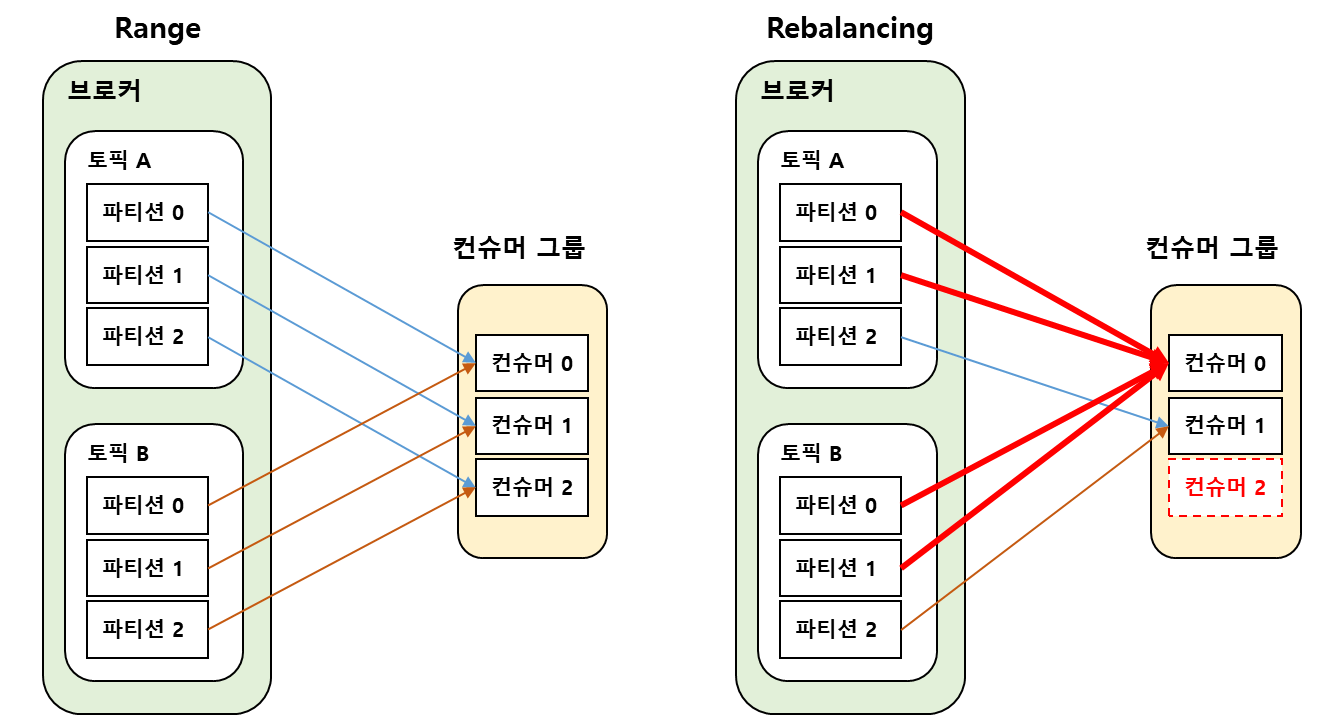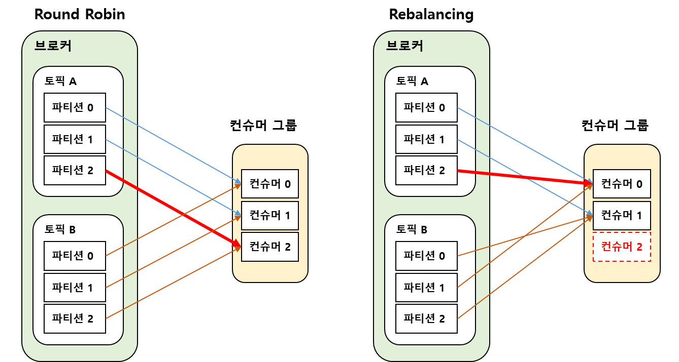 리밸런싱은 컨슈머 그룹 내에서 컨슈머에 변경이 생길 때 파티션과 컨슈머의 조합을 변경하는 과정이다.