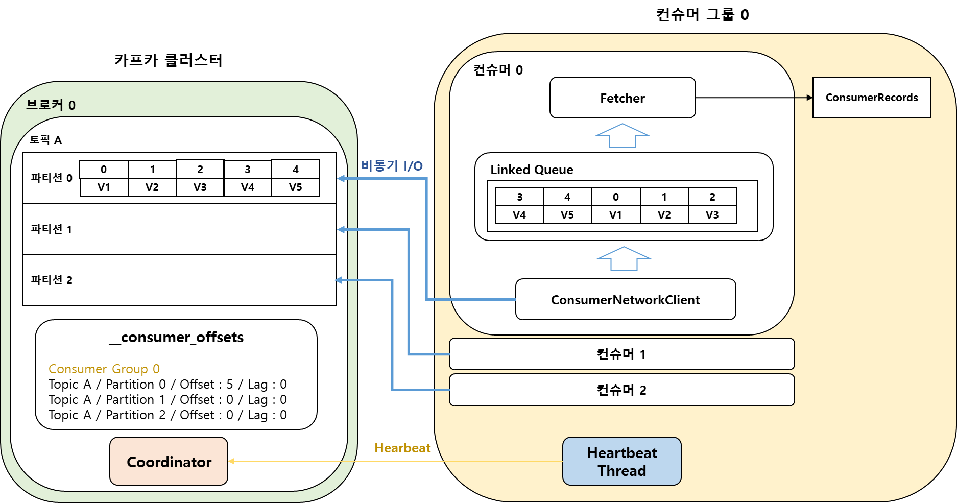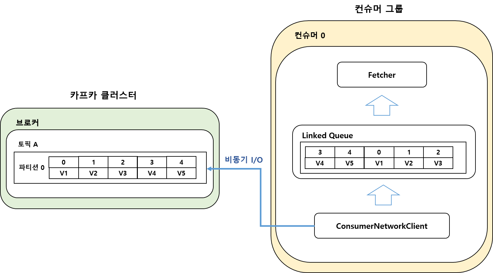 - ConsumerNetworkClient는 비동기로 계속 브로커의 메시지를 가져와서 Linked Queue에 저장
