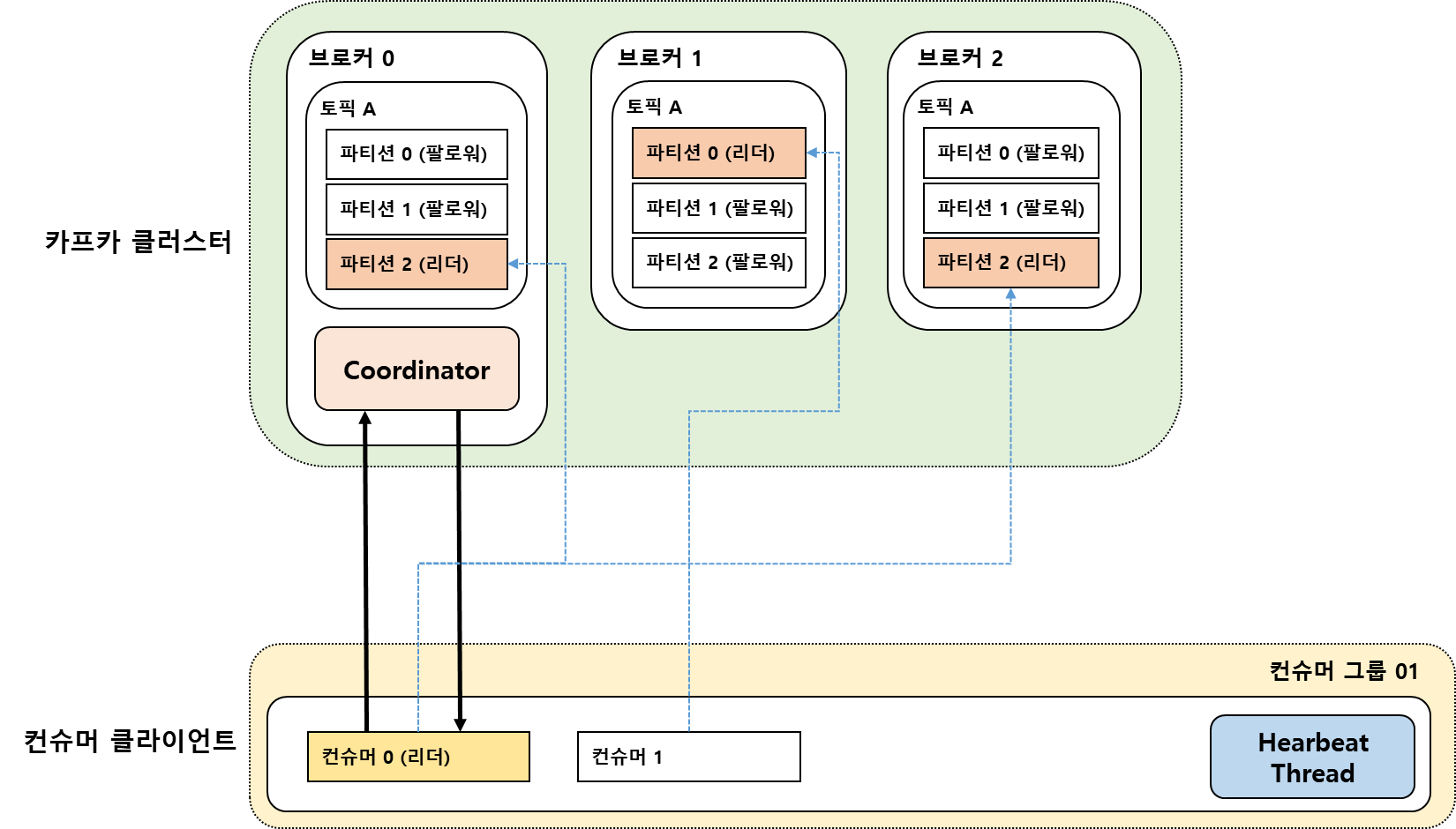 Group Coordinator 는 카프카 브로커중 한대가 담당하는데 컨슈머 Hearbeat 을 받아 컨슈머가 동작중인지 확인하고,